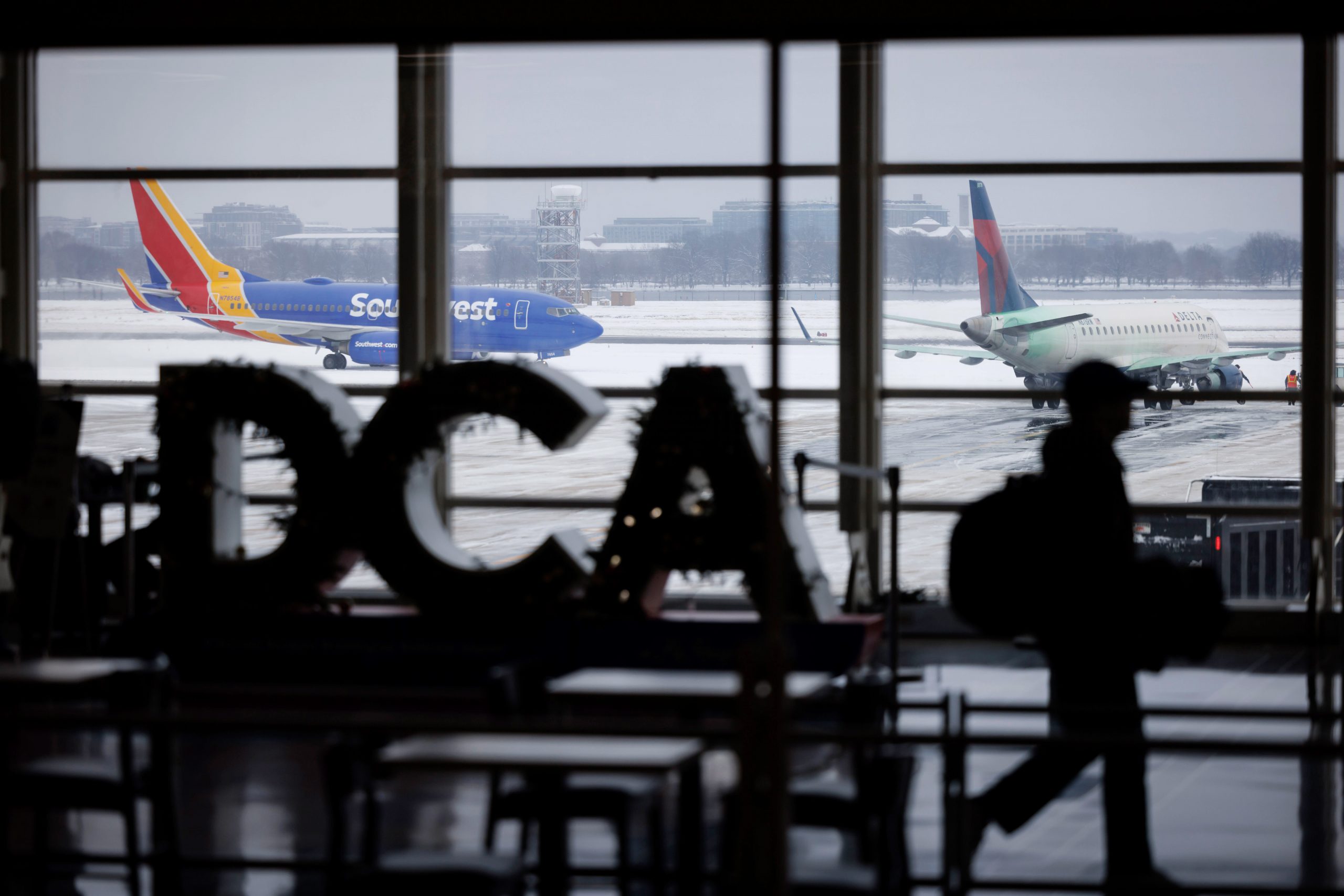 Airplanes on the tarmac during a snow storm at Ronald Reagan Washington National Airport in Arlington, Virginia, US, on Monday, Jan. 6, 2025.