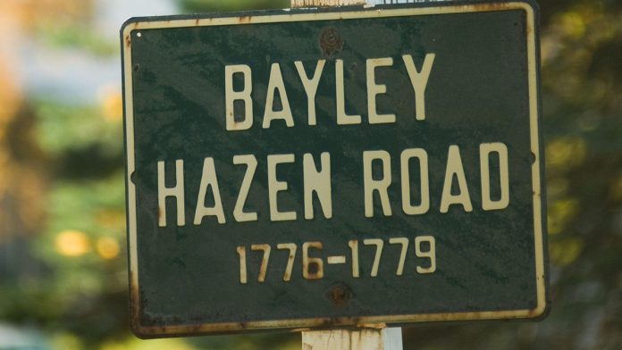 The Bayley Hazen Road in Vermont was conceived to deliver supplies to American troops fighting in Quebec in the American Revolution. It was never completed. Remnants of the road today offer haunting reminders of the fight for American independence. Sign in Peacham, Vermont. (Kindra Clineff/Alamy Stock Photo)