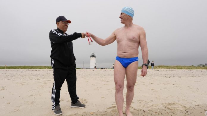 Lewis Pugh will swim in 47-degree waters without a wetsuit in an effort to change the public’s perception of sharks, he said. (AP Photo/Robert F. Bukaty)