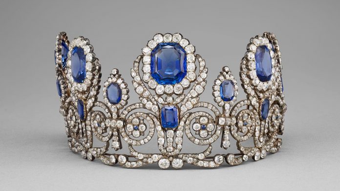 This diamond and sapphire tiara belonging to Queen Marie-Amelie, the last queen of France, and worn as well by Queen Hortense and Isabelle of Orleans, was stolen in a brazen heist on Oct. 19. The tiara contains over 1,000 diamonds, according to the Louvre.  (Stéphane Maréchalle/RMN-Grand Palais)