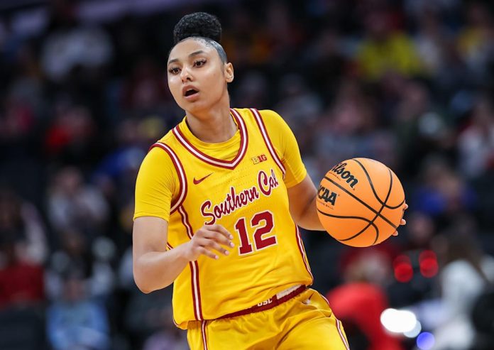 JuJu Watkins and the USC Trojans play the UNC Greensboro Spartans this afternoon during March Madness 2025. (Michael Hickey/Getty Images)