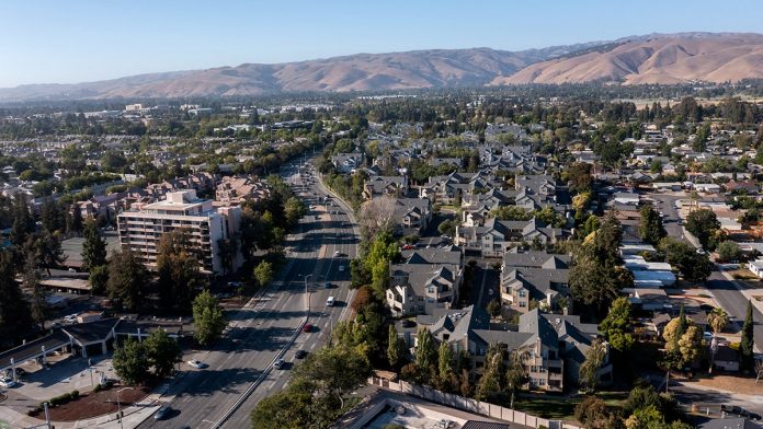 Aerial view of Fremont, California with homes, mountains and highways.