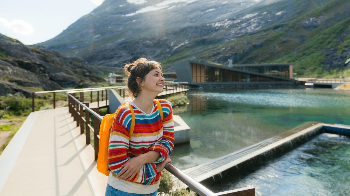 Woman on viewing platform near the river at Trollstiegen viewpoint in Norway